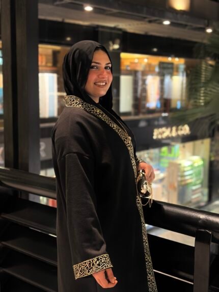 A timeless black kaftan adorned with elegant Arabic letter embroidery, blending cultural heritage with modern sophistication.